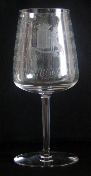 Wijnglas, glas met tulpvormige kelk op zeshoekige steel en ronde voet, gegraveerd met het stadswapen van Brielle en de tekst 'Aan U bezorg' ons werk plezier Van ons klinkt op een roep: Zij hier des Vroedschaps wens verhoort Brielle - sleutel van Europoort M.H.Trompmuseum 6 mei 1960'. Dit glas is vervaardigd ter gelegenheid van de ...