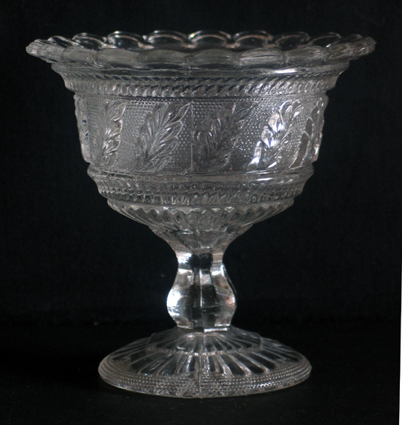 Suikerpot of suikerschaal, transparant met geschulpte rand en ronde voet. Het oppervlak van de schaal is bewerkt met veren of varens(?) en geometrische motieven.