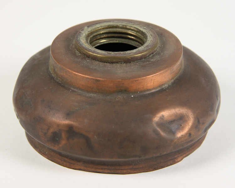Koperen oliereservoir. Halve bolvorm op lage voet. Bovenaan schroefdraad waar de brander met lont opgedraaid kan worden.
