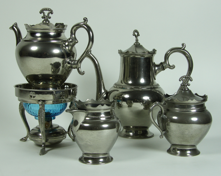 Servies bestaande uit een theepot, koffiepot, melkkannetje, suikerpot met deksel en een theelicht.