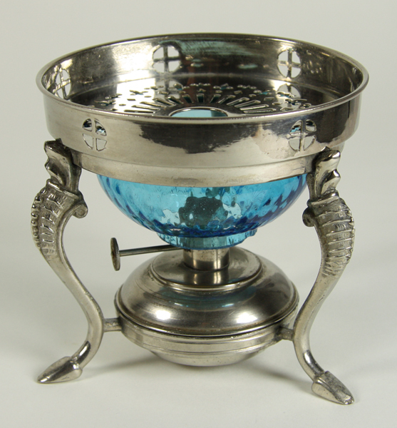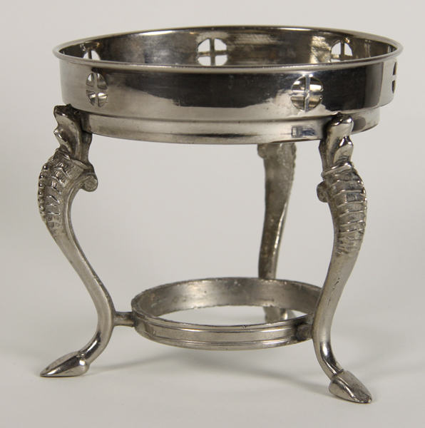 Onderstel van theelicht. Rond, met drie s-vormige poten in de vorm van vissen, voorzien van opengewerkte cirkels in de bovenste rand.