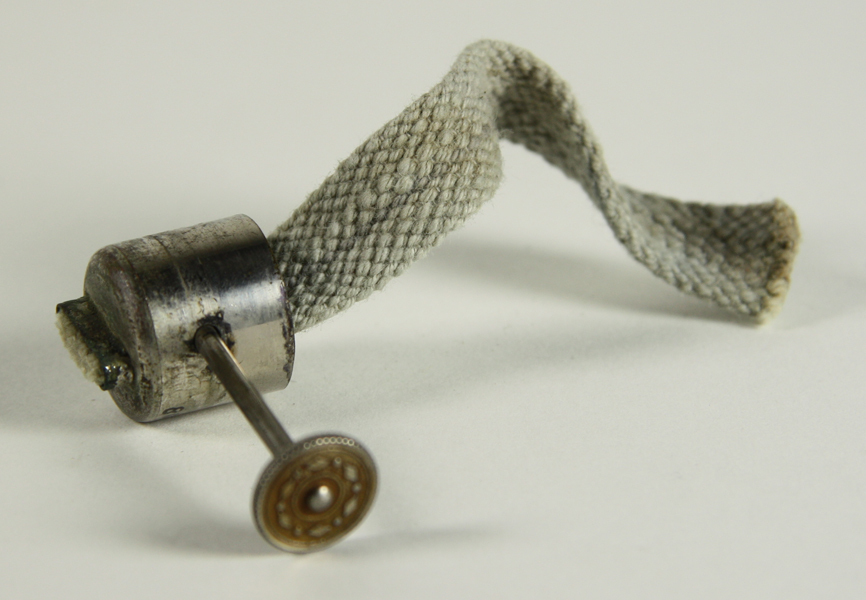 Brander van theelicht, rond met draaiwiel aan stang en lont erin.