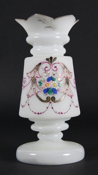Vaas, doorschijnend wit, met voet en bloemvormige opening, wit doorschijnend, aan de voorzijde voorzien van een polychrome bloemversiering met ranken er omheen en een slinger eronder.