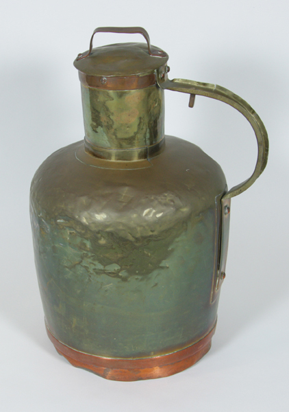 Koperen melkbus met gebogen handvat, geel en rood. Met rond deksel met bovenop een rechthoekig handvat, geel en rood. Aan één zijde gedeukt.