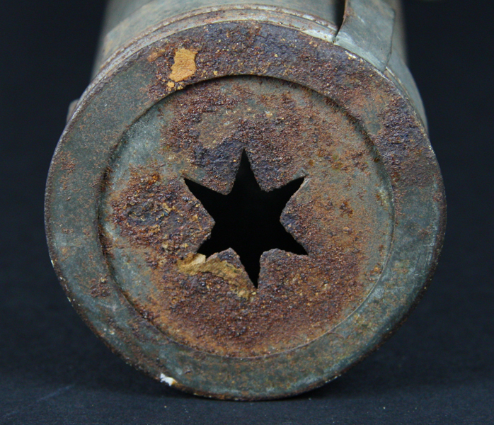 Metalen onderdeel van slagroomspuit. Cylindrisch, met ophanghaak en aan de onderzijde voorzien van een eens verwisselbaar vormplaatje, in de vorm van een ster.