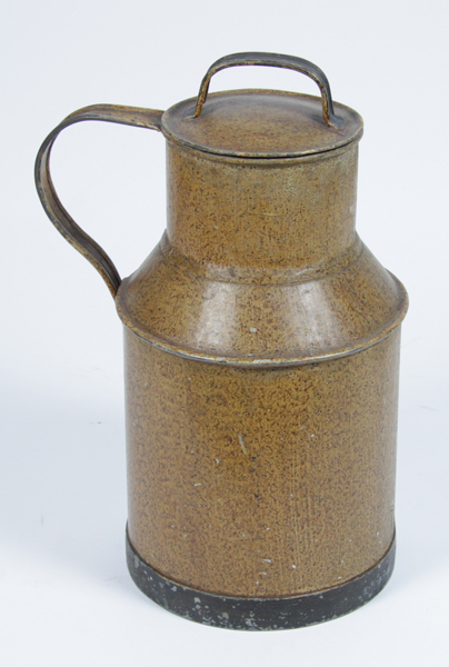 Melkbus met gebogen handvat. Geelbruin van kleur met een zwarte rand langs de bodem. Met los deksel met handgreep.