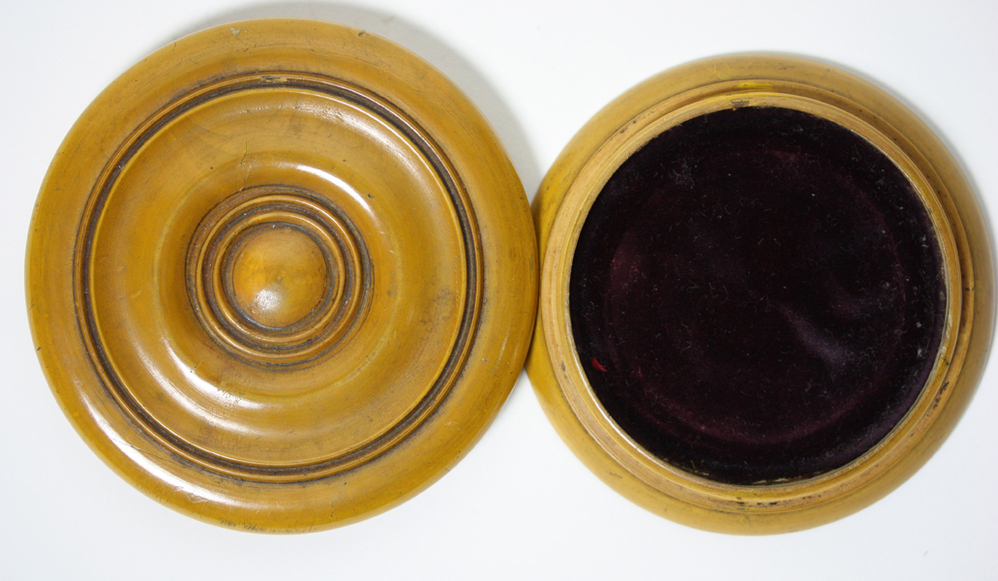 Bruin houten penningdoos. Onderste deel bekleed met paars textiel. Los deksel met gedraaide ringen op bovenzijde. Doos sluit door middel van schroefdraad.