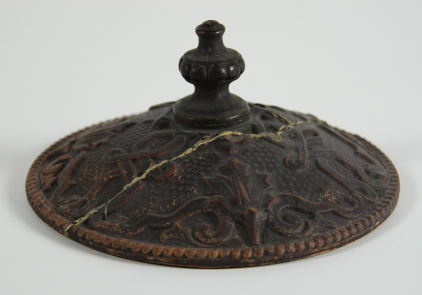 Deksel van bruine tabakspot. Rond met knop en voorstelling van bloemen en fantasieranken in reliëf. Gelijmd.