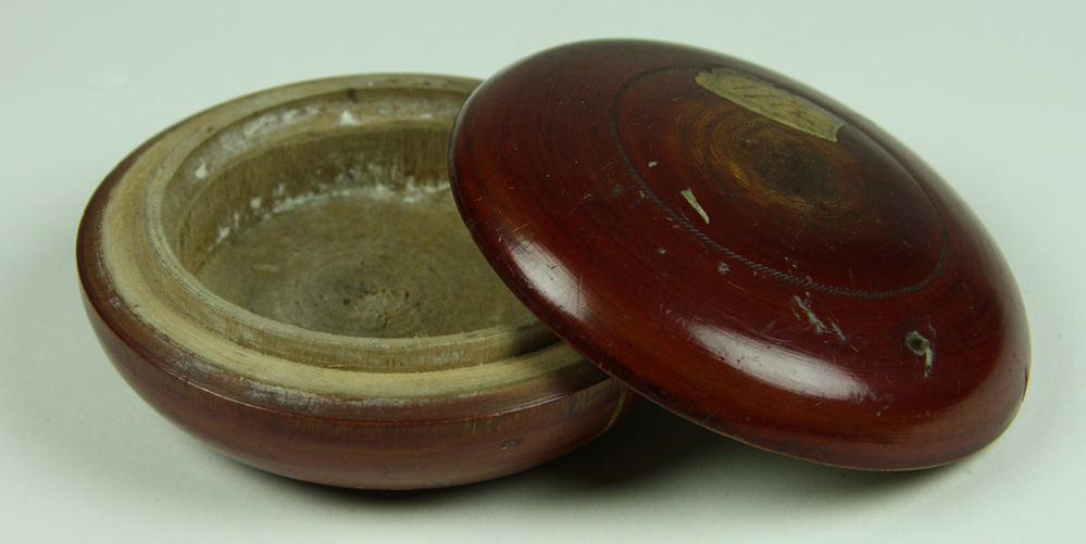 Rond houten doosje. Aan de binnenzijde ongelakt hout. Aan de buitenzijde donkerder, gelakt hout. Beide delen worden op elkaar geklemd, zonder schroefdraad. In het onderste deel zit een barst.