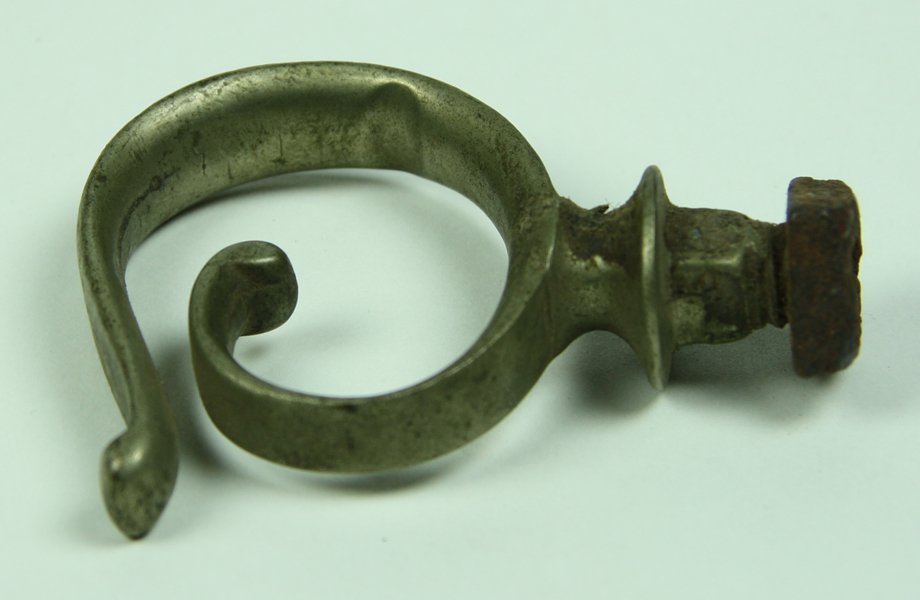 Handgreep, bestaand uit platte gegolfde krul met schroefdraad aan de achterzijde