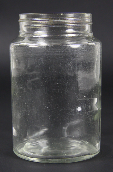 Glazen voorraadpot. Cylindervormig, transparant, met schroefdraad aan de bovenzijde.