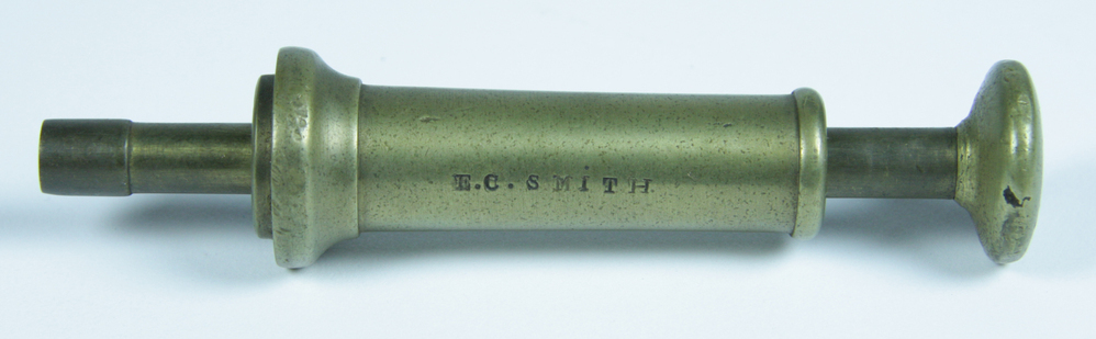 Staaf met een ronde, platte knop erop en een cylindrische huls over de staaf, met daarop gegraveerd 'E.C. SMITH'.