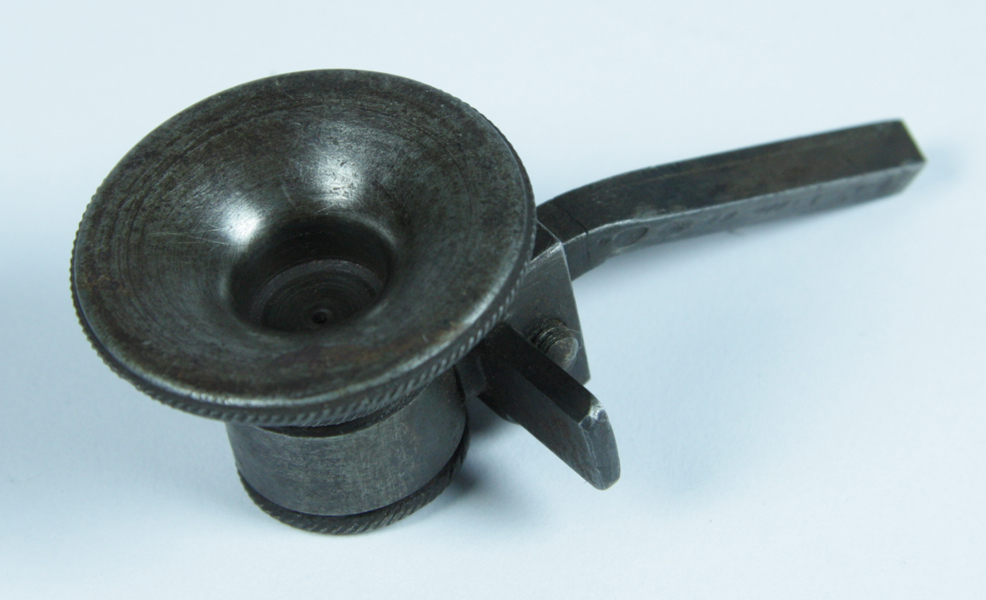 Diopter. Rond trompetvormig deel met een opening in het midden. Een blokje met klemschroef eronder en een vierkant gevormde staaf die iets naar achteren is gebogen.