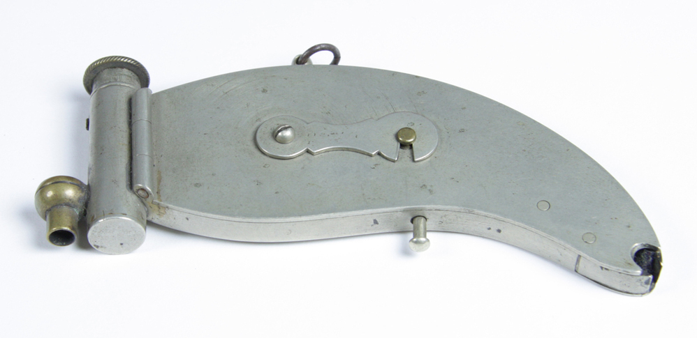 Doosje voor percussiekapjes bij matchgeweer. Plat en amandelvormig. Met een scharnierende bovenplaat en een huls ernaast met een verend buisje erin. Aan de bolle zijde van de amandelvorm een ophangoog. Onderaan een kleine pin om het deksel te openen.
