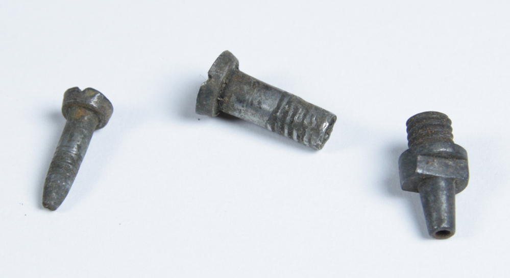Drie losse schroeven bij geweer. Verschillend van afmeting en vorm.
