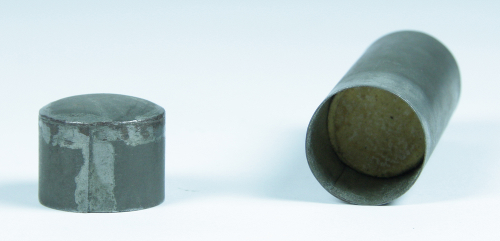 Metalen koker met deksel. Cilindrisch van vorm. Binnenin ronde kogellapjes. De bodem is omhoog te drukken, waardoor de inhoud uit de huls te nemen is. Bedoeld om kruitlading te scheiden van de kogel.