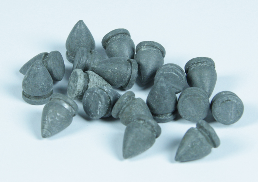 Achttien puntvormige kogels, met scherpe insnoering bij de basis.