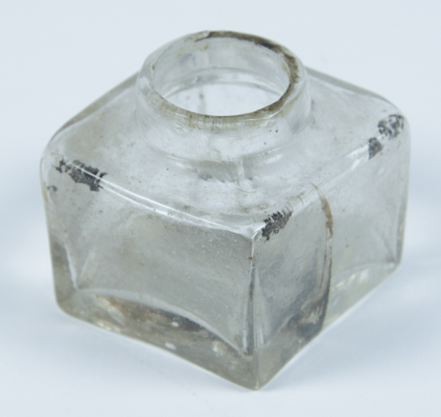 Inktpot van inktstel, vierkant, transparant, met ronde opening en inktresten aan binnenzijde.
