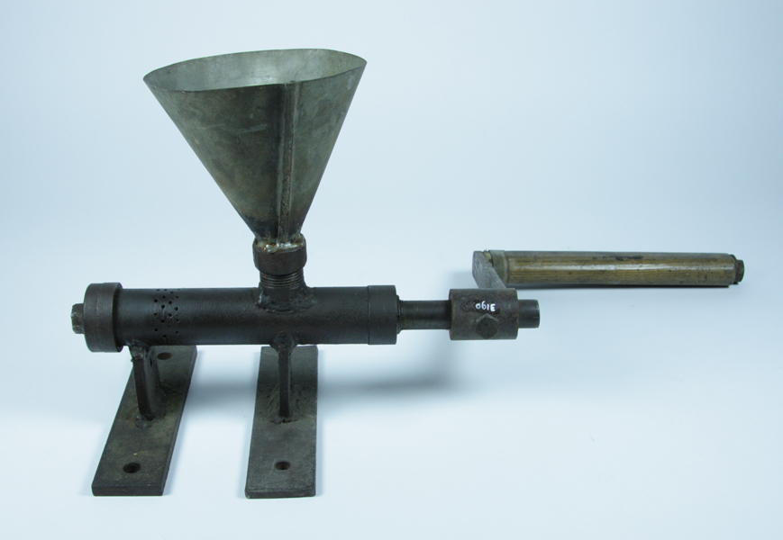 Gehaktmolen met trechtervormig vulstuk met schroefdraad, een slinger en bevestigingsvoetstuk.