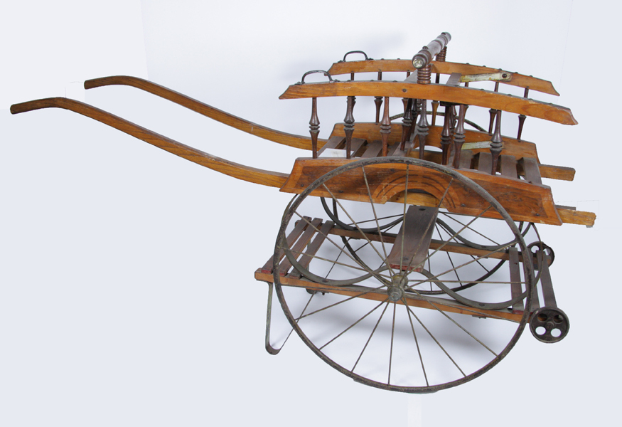Houten handkar op twee grote wielen. Aan de voorzijde nog twee kleine wielen. Aan de achterzijde metalen steunen en twee lange houten handgrepen. Aan de voorzijde een omklapbaar rekje. Gebruikt als wandelwagen voor twee kinderen.