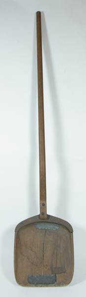 Houten schep of broodschieter, bruin, met breed schepdeel en lange steel, gebruikt in bakkerij(?).