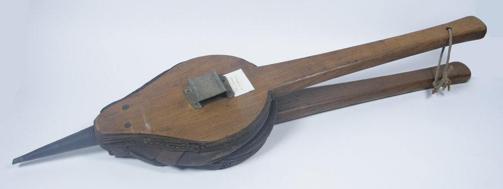 Houten blaasbalg met leren zak en metalen mond.