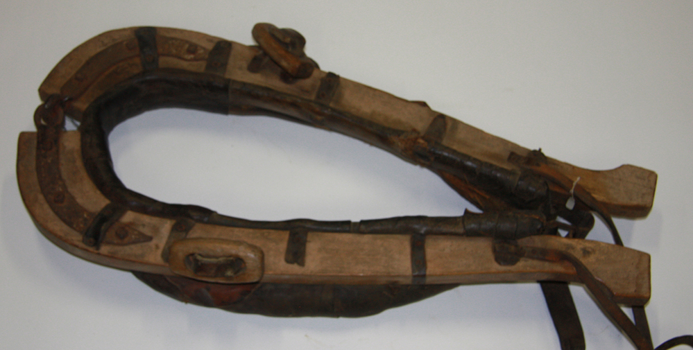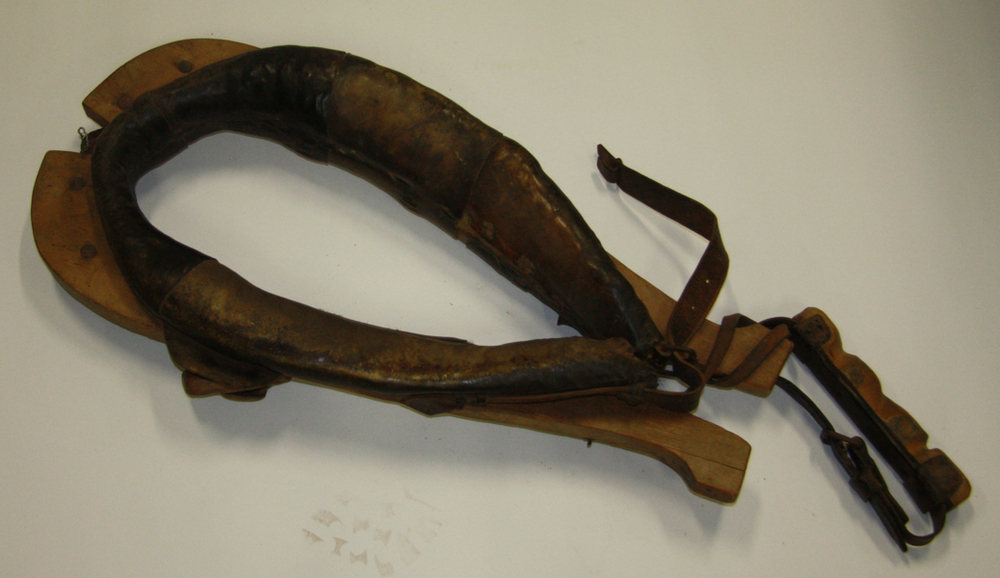 Gareel voor paard, ovaal, met ijzerbeslag en leren beschermkussens en riemen.