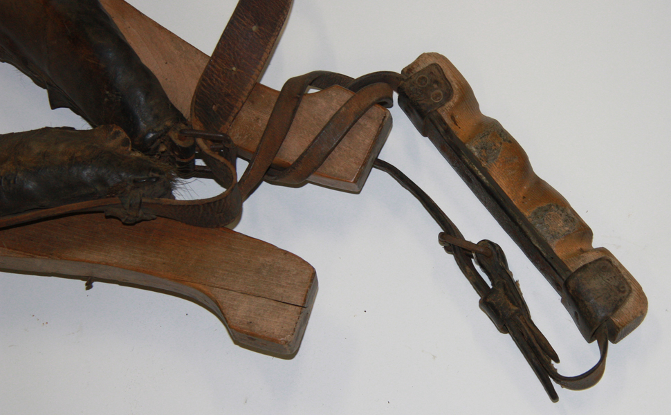 Paardenlichter van hout met leren riem en metalen gesp.