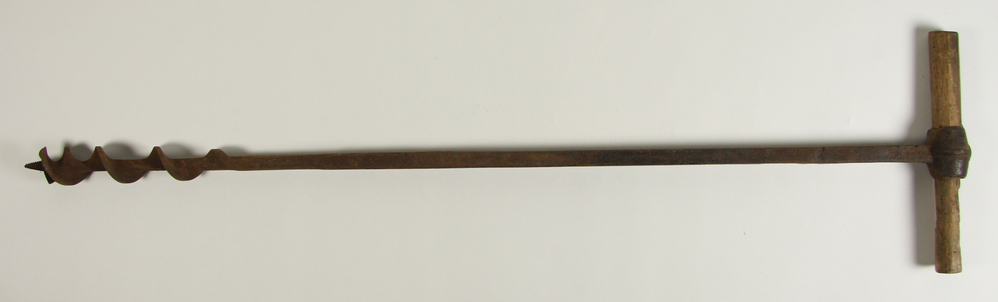Schroefboor, bestaand uit een staaf met aan het uiteinde een schroefdraad en aan de bovenzijde een opening waardoor haaks een handvat is geschoven.