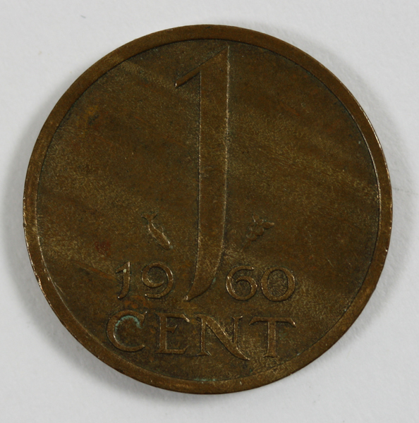 Cent uit de regeringsperiode van koningin Juliana. Op de voorzijde haar portret met naar rechts gewend gezicht. Op de keerzijde de waarde en het jaartal.