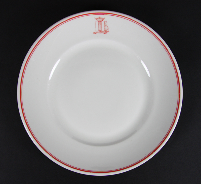 Plat bord. Wit met dubbele rode rand en het gemeentewapen van Brielle in rood.