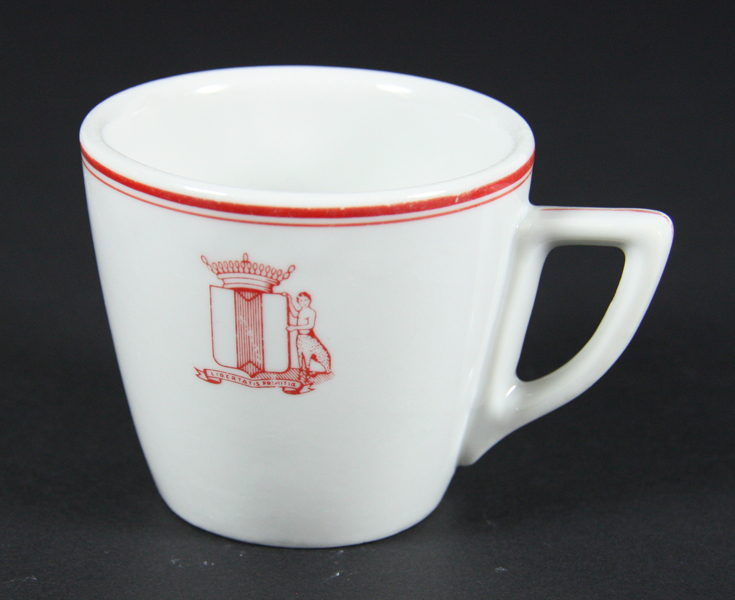 Koffiekop. Wit porselein met dubbele rode rand en een afbeelding van het gemeentewapen van Brielle in rood op de voorzijde.