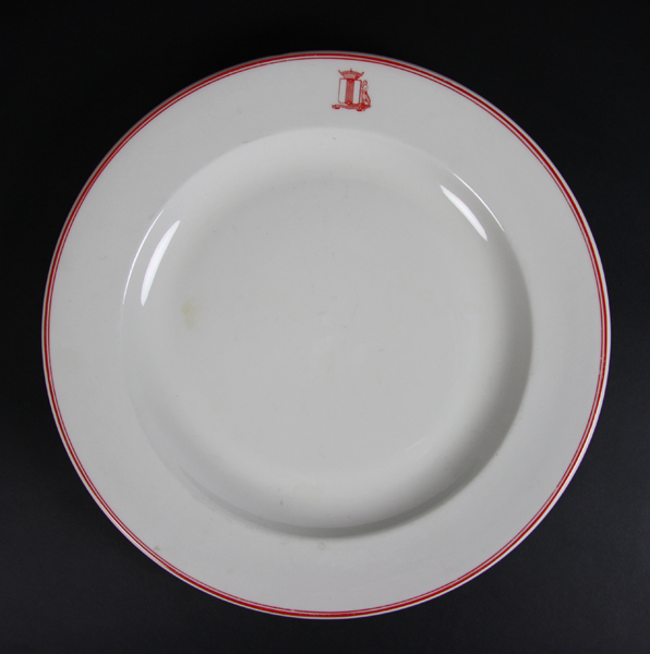 Gebakschaal, rond, wit met rode bies langs de rand en op de rand een afbeelding in rood van het gemeentewapen van Brielle.