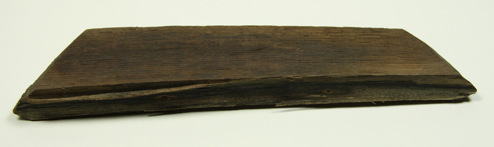 Houten duig van vat. Met afgeronde hoeken. Waarschijnlijk van de bodem.