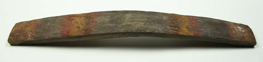 Houten duig. Op de holle zijde een inkepeing aan beide uiteinden. Op de bolle zijde sporen van metalen hoepels.