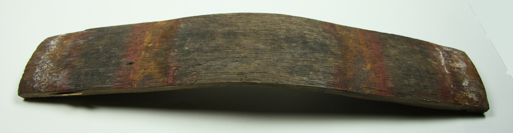 Houten duig. Op de holle zijde een inkeping aan beide uiteinden. Op de bolle zijde sporen van metalen hoepels.