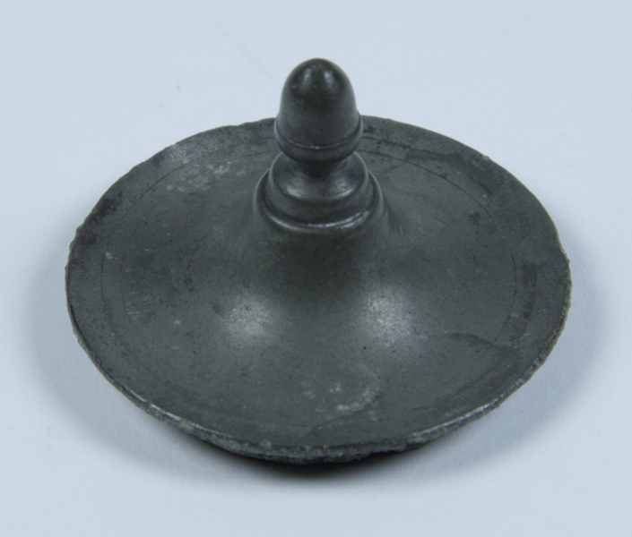 Tinnen inktpot met losse ring en deksel. Grijs, rond, op een schotel met iets opstaande rand.