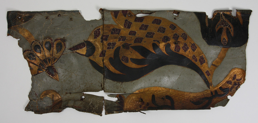 Fragment goudleer. Versierd met exotische bloemmotieven in zilver en goudkleur op een grijze achtergrond