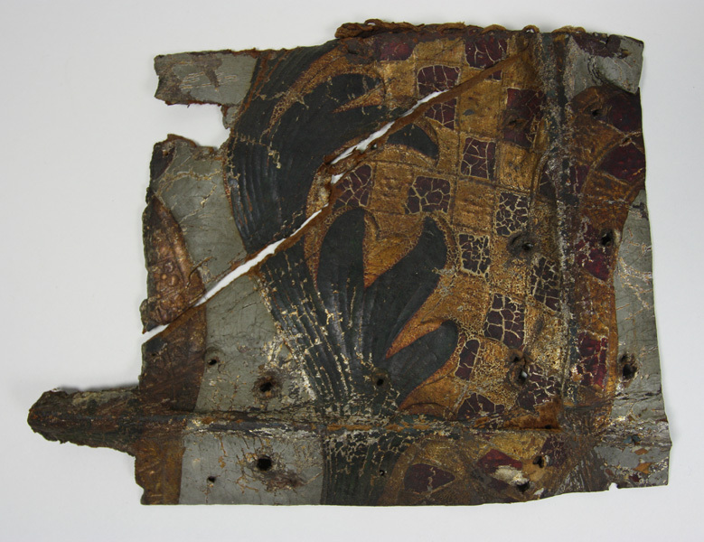 Fragment goudleer. Versierd met exotische bloemmotieven in zilver en goudkleur op een grijze achtergrond.
