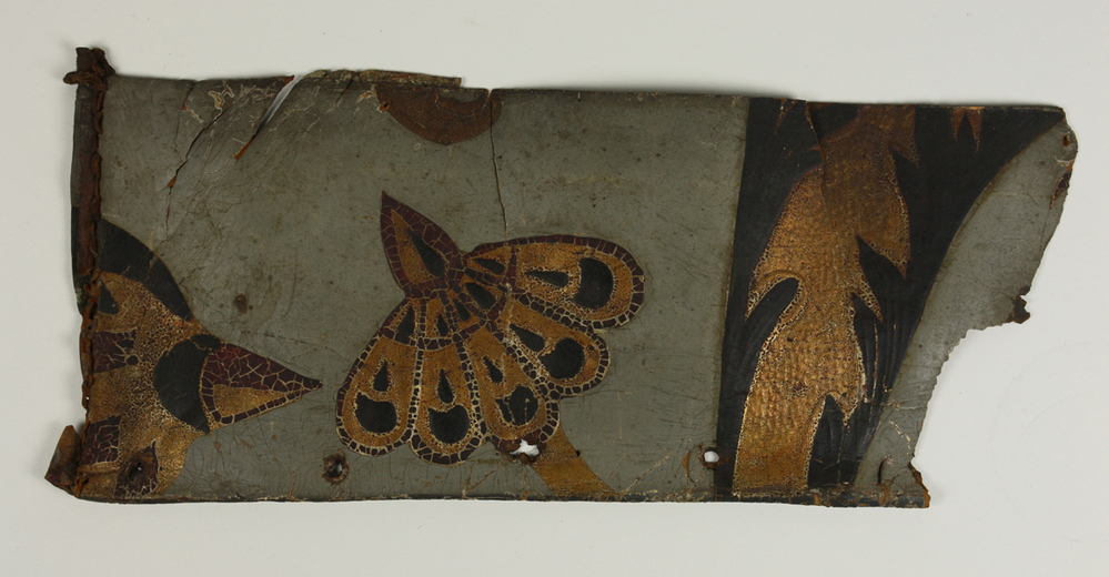 Fragment goudleer. Versierd met exotische bloemmotieven in zilver en goudkleur op een grijze achtergrond.