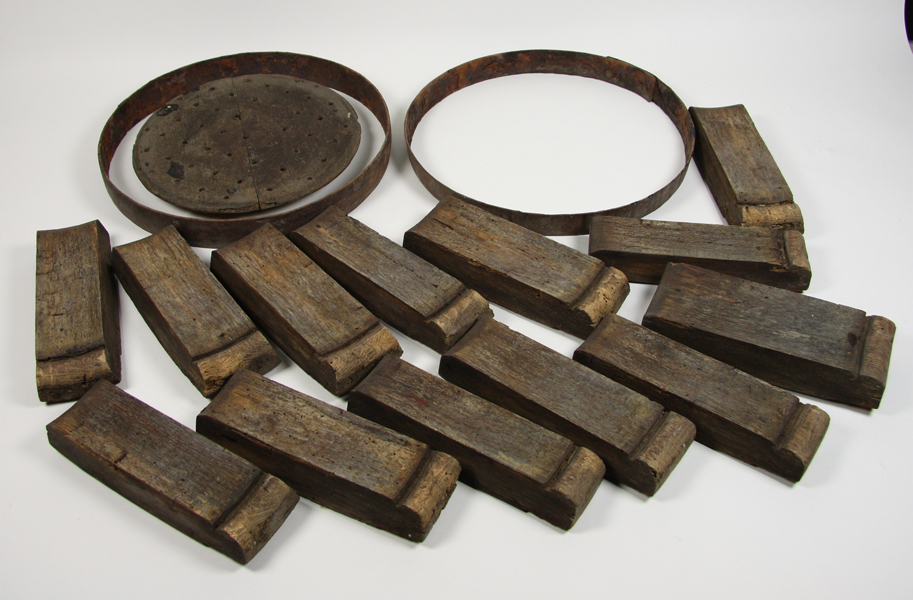 Houten ton in losse delen. Een rond houten bodem in twee delen, twee metalen ringen en dertien houten duigen.