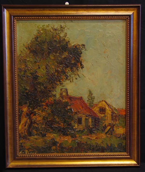 Schilderij, getiteld: Oude huizen bij de wal achter de zaak van Langeveld en stalhouderij van Lankhorst. Olieverf op board. Dorpsgezicht met twee huizen en een boom links voor. Grove, pastueuze manier van schilderen.
