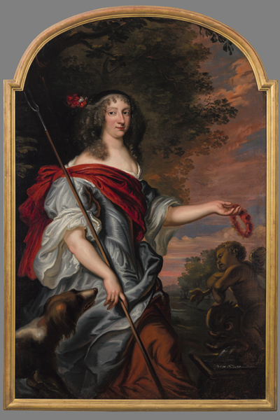 Portret van koningin Christina van Zweden (1626-1689) afgebeeld als de godin Diana. In de linker beneden hoek een hond. in de rechterhand van Christina een speer en in haar linkerhand een lauwerkrans. Op de achtergond een jachtgebied met een putto.