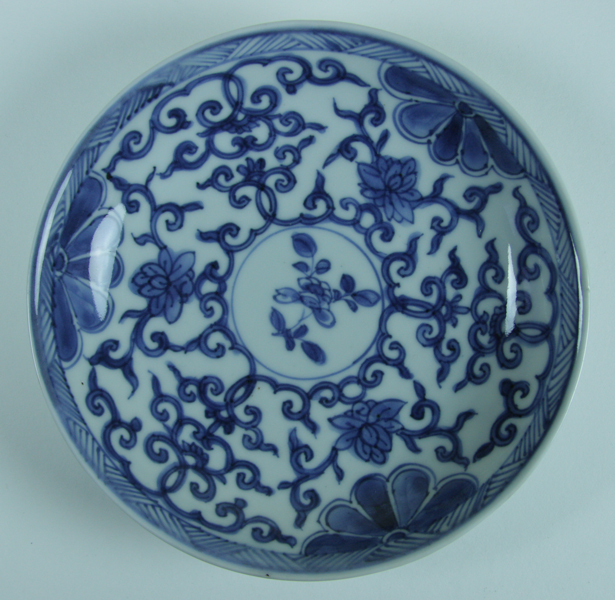 Porseleinen schotel, blauwwit met decor van lotusbloemranken en halve kiku's (gestileerde chrysanten)
