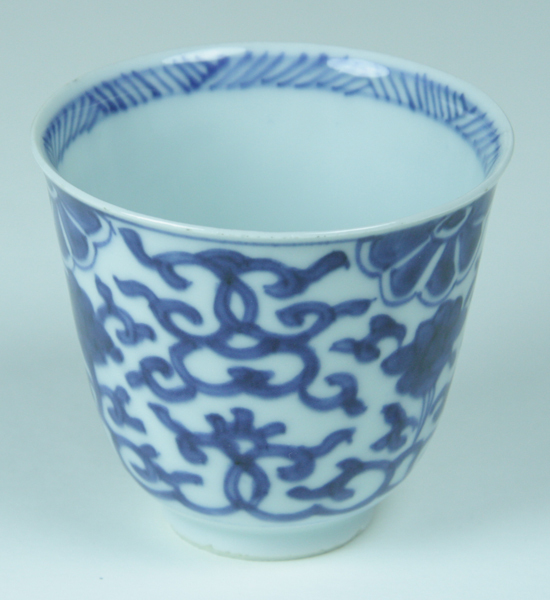 Porseleinen, blauwwitte koffiekop met decor van lotusbloemranken en halve kiku's (gestyleerde chrysanten)