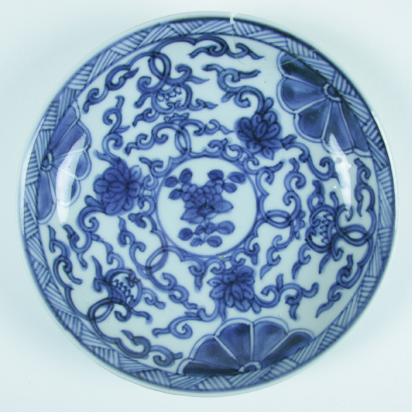 Porseleinen schotel, blauwwit met decor van lotusbloemranken en halve kiku's (gestileerde chrysanten)