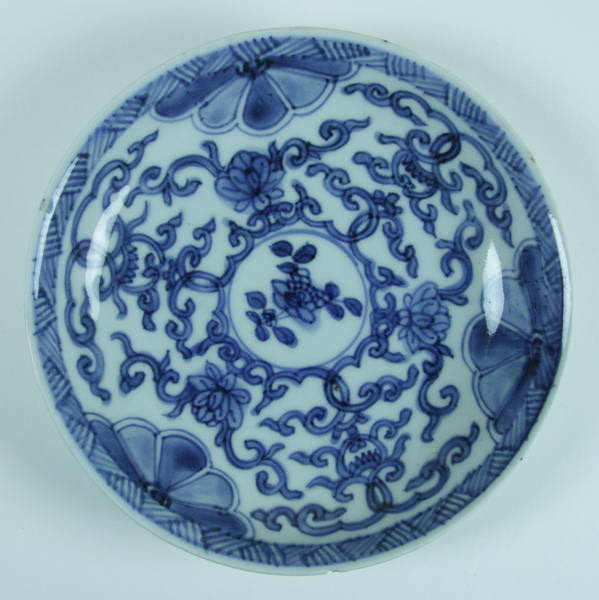 Porseleinen schotel, blauwwit met decor van lotusbloemranken en halve kiku's (gestileerde chrysanten)