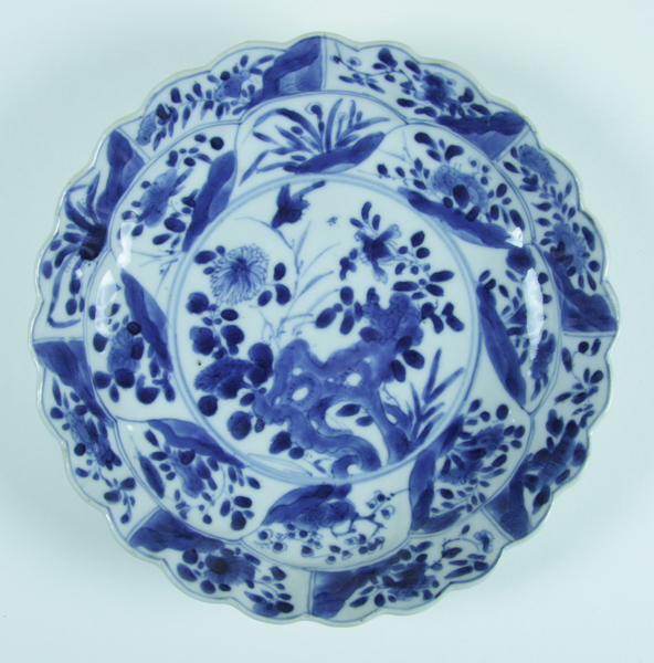 Schotel van blauwwit porselein met twee banden met perken in relief met plantendecor, plat met bloeiende planten bij rots.