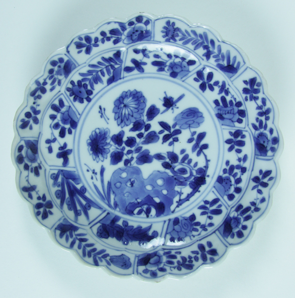 Schotel van blauwwit porselein met twee banden met perken in relief met plantendecor, plat met bloeiende planten bij rots.