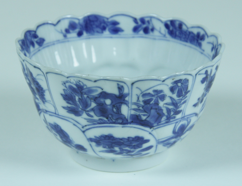 Kop van blauwwit porselein met twee banden met perken in relief met plantendecor, plat met bloeiende planten bij rots.